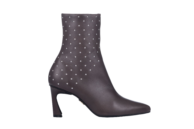 特有心形鞋跟增添造型感,嚴選皮革料製成,搭配鉚釘裝飾的日常鞋款,暖色棕調帶點金屬元素讓你擁有多元面貌。